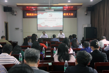 5月7日下午,继教学院在金盆岭校区14教200教室,召开全面从严治党暨警示教育大会。学院党政班子成员、部门负责人和全体教职工(含外聘职工)党员参加。党总支书记何纯芳作《学史力行,落实全面从严治党责任,确保完成2021年目标任务》的工作报告,院长颜鲜明主持。