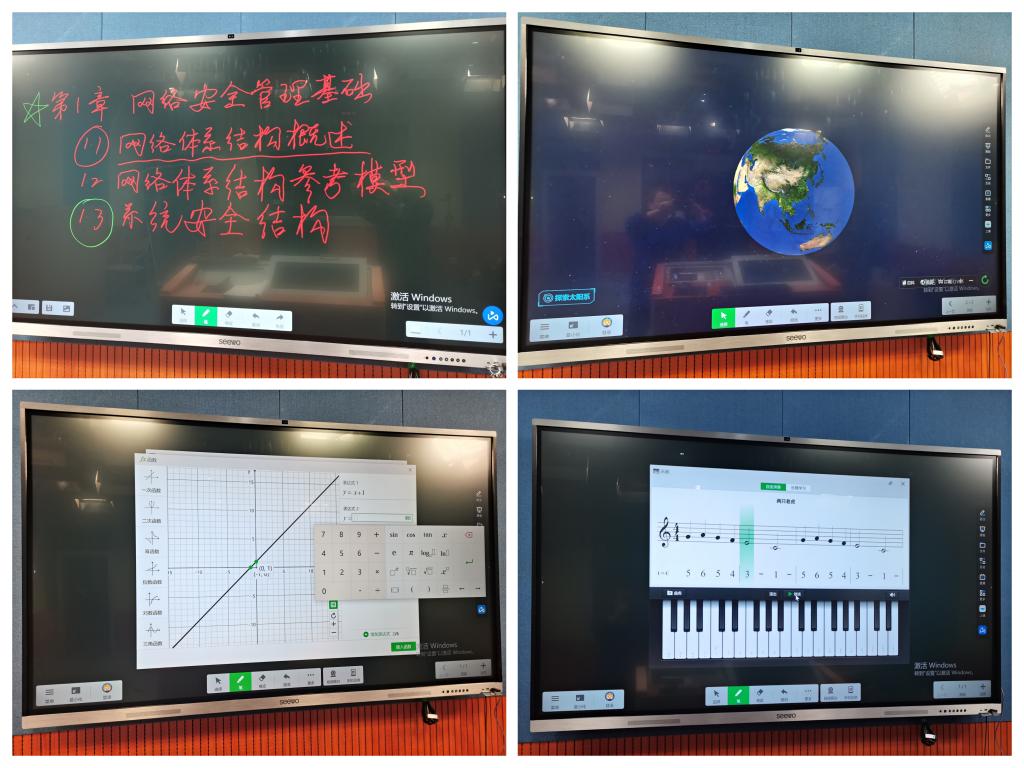 此次更换的智能平板跟原来的液晶显示屏相比,不仅分辨率大大提升,而且增加了许多辅助教学的功能:如电脑白板、无线麦克扩音、兼容翻页笔和激光教鞭、智能读写等等。教师不仅可以在智能平板上写写画画,添加规范的数、理、化教学公式板书,还可以进行模拟地球仪旋转、模拟钢琴键盘谱曲等有趣的交互演示。智能平板提供的各种智能化教学工具可以为授课老师带来简单高效的教学互动,有力激发学生的学习兴趣,大大提升课程的教学效果。