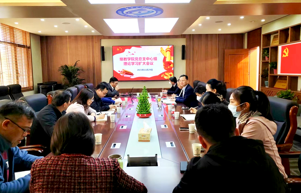 2023年11月29日下午,继教学院党总支在15教四楼会议室召开了中心组理论学习(扩大)会议,学习全国宣传思想文化工作会议精神,学习习近平总书记在同中华全国总工会新一届领导班子成员集体谈话时的重要讲话精神,并结合学院实际,就如何加强学院文化建设、进一步做好新形势下意识形态工作,充分调动广大职工群众的积极性、主动性、创造性进行研讨。学院党总支书记何纯芳主持,院长邹兴平和副书记谢士成作中心发言,党总支成员和各部门主任参加会议。