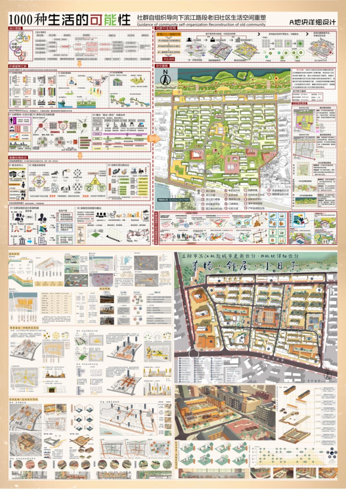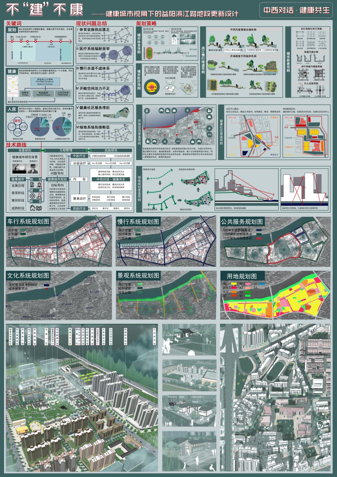 由邓斌、欧阳慧婷、黄铭东、张婷婷四位同学完成的两组方案均为益阳市滨江路地段老旧社区的更新设计。第一组方案“江南都市”提出“社群自组织”目标导向的概念,它强调社群性和自组织性,针对现状提出三大策略,一是市井重塑,二是空间交融,三是时空的共享。将基地更新改造成具有人间烟火味和市井小生活社区,以达到社会关系的共存,人群的共生以及空间的共享,最终实现“共建、共生、共享”的社区生活新模式。第二组方案“不建不康”基于中西医疗法理念,选取典型空间进行定性和定量相结合诊断分析,注重生活氛围的营造和特色业态的改造,以期获得健康的人居环境。两组方案概念新颖独特,得到专家一致好评。经过一天的方案展示、学生汇报、专家评审等环节,最终分别取得一等奖和三等奖的好成绩。本次竞赛成绩反映了我院城乡规划专业的办学实力,也凸显了taptap点点学生的专业素养。我系将再接再厉,为社会培养高素质的人才,为国家城乡建设做出应有的贡献。