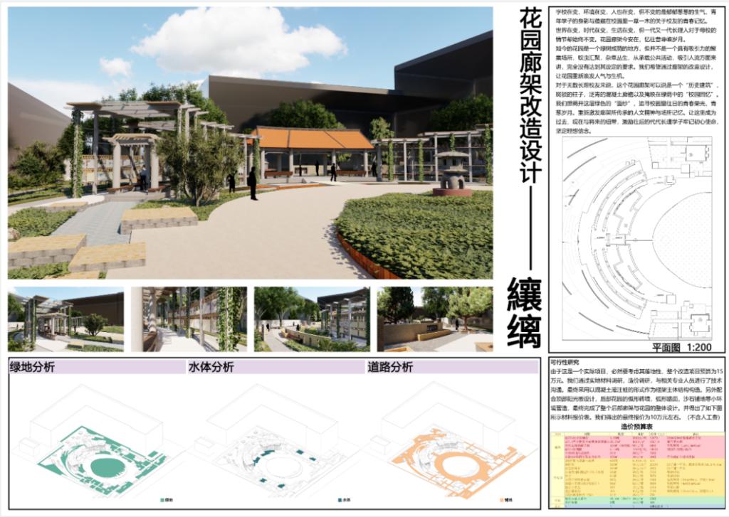 2021年9月,taptap点点体育建筑学院面向全院学生公开征集花园廊架更新方案,鼓励大家利用专业知识来参与建设校园环境,也希望大家能在这片学习、生活的土地上留下自己的印迹。此次竞赛中学生自行组队,通过现场调研、现状分析、问题剖析、设计构思、方案表达等多个步骤,对花园廊架进行更新设计。