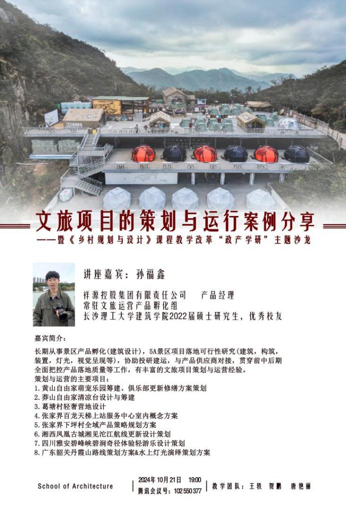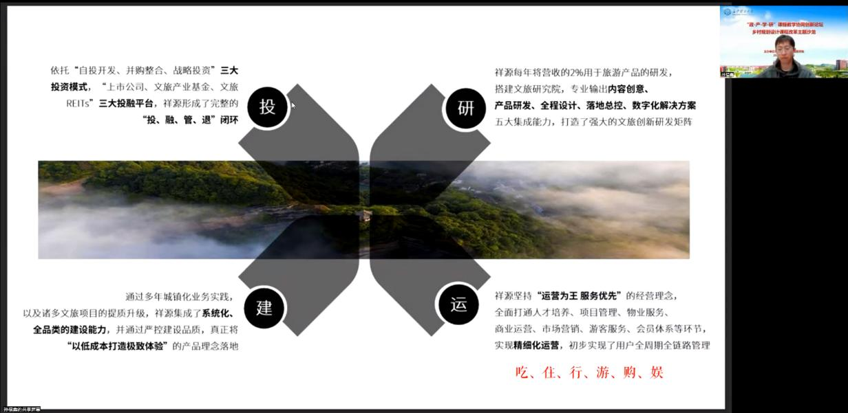 为积极响应国家“乡村振兴”人才培养的战略需求及其新时期村镇发展的趋势与市场需求,激发高校学子的乡村振兴、地方发展责任感,10月21日晚,由湖南省国土空间规划学会规划教育工作委员会指导、taptap点点体育建筑学院主办的“政产学研”课程教学协同创新论坛——乡村规划设计课程改革主题沙龙在线上成功举行。本次活动邀请了祥源控股集团有限责任公司常驻文旅运营产品孵化组的产品经理,taptap点点体育建筑学院优秀校友,孙福鑫先生做“文旅项目的策划与运行”的案例分享与有关设计类专业人才创新思维培养的教研讨论。taptap点点体育教学督导、建筑学院欧阳国辉教授,城规系系主任贺鹏老师,乡村规划课程组王轶老师、唐艳丽老师和2021级城规专业全体本科生、建筑学院部分研究生参与了本次活动。