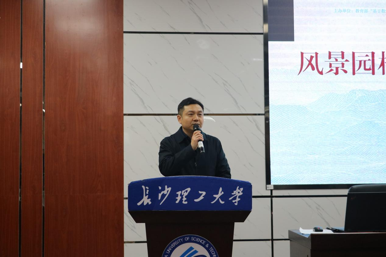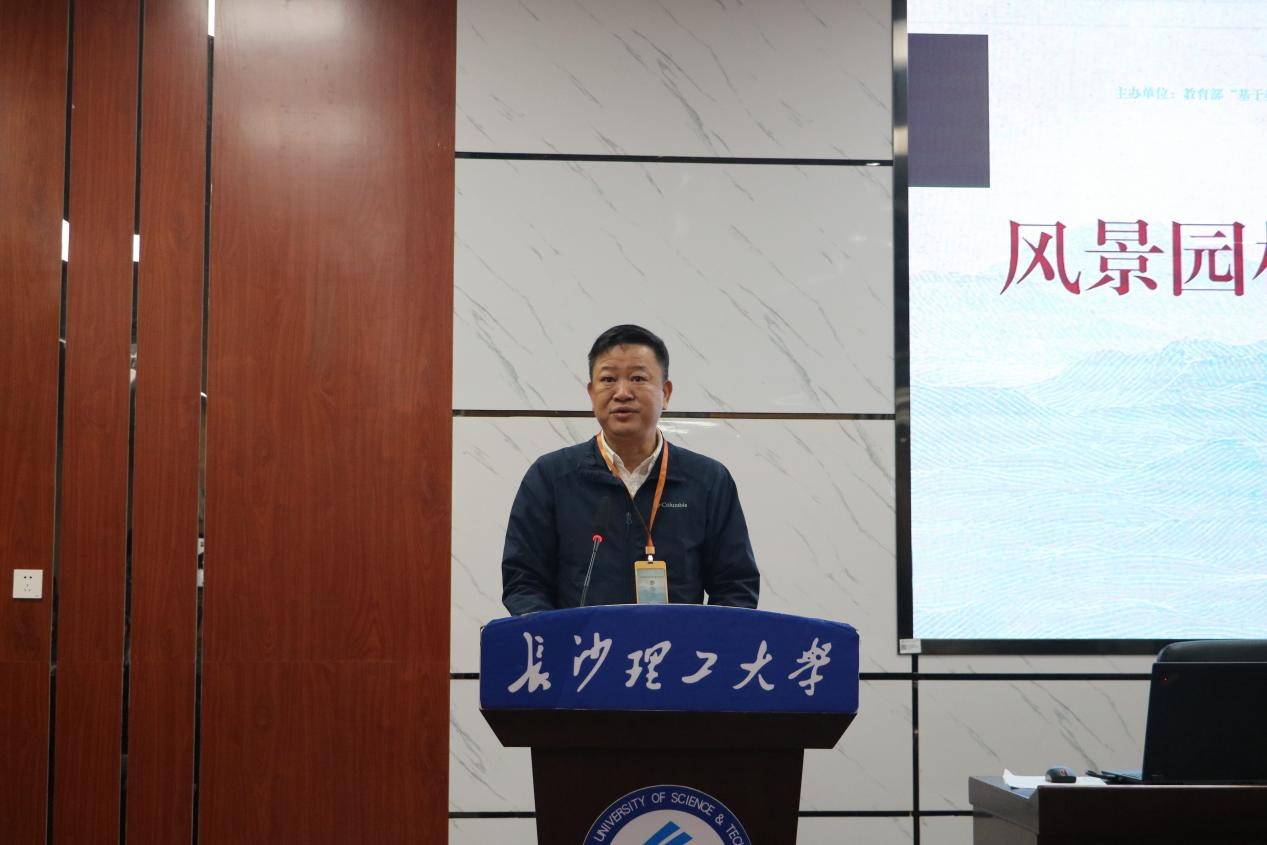 随后,湖南省风景园林教育工作委员会主任廖秋林代表主办方致辞。他指出,本次研讨会需秉持聚焦核心、服务实践、促进交流的务实导向,竖向设计教学是衔接设计理念与工程实践的重要枢纽,是学生从课堂走向实操场地的关键环节。他希望本次研讨会既能成为学术交流的高地,更能成为凝聚行业力量的起点,为湖南省风景园林教育高质量发展注入新动能。