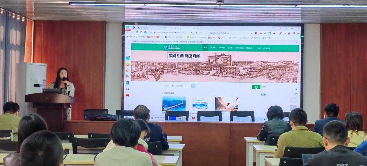 随后,学院针对现代信息技术和人工智能的快速发展,为促进教学课程的智能化,提高教师数字化教学能力,助力教学高质量发展,特邀超星泛雅集团湖南分公司龚莹老师围绕如何利用超星教学平台,搭建“课程知识图谱”的应用场景进行现场讲授。龚老师首先介绍了国家教育信息化的政策背景及发展趋势,随后从知识图谱构建、AI助教、AI应用等方面,现场展示了如何依托超星教学平台和学习通平台,进行在线课程建设、知识图谱构建、AI教学助手应用,详细讲解了如何通过整合教学资源和优化课程设计来构建智慧课程。