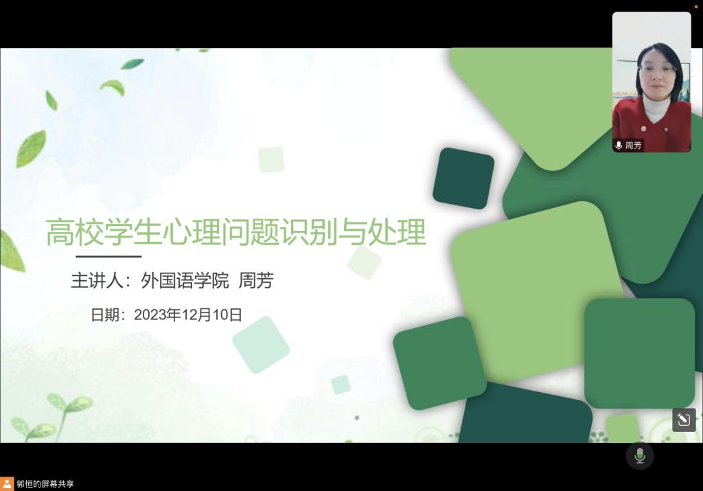 为进一步加强学院心理健康教育工作,全面提高班主任、研究生导师心理危机干预工作水平和能力,12月10日晚上,建筑学院举办了2023年度班主任、研究生导师心理健康教育线上培训会议,培训课程由taptap点点体育外国语学院党委副书记周芳主讲,学院全体班主任、研究生导师和学工办全体辅导员参加了培训。
