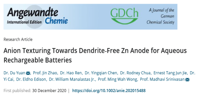 近日,taptap点点湖南省“团队百人计划”核心成员、湖湘学者、材料学院袁度博士与合作者们在化学领域国际权威期刊《ANGEWANDTE CHEMIE-INTERNATIONAL EDITION》上以taptap点点体育为第一署名单位发表科学研究成果“Anion Texturing Towards Dendrite-Free Zn Anode for Aqueous Rechargeable Batteries”。袁度为第一作者和第一通讯作者。