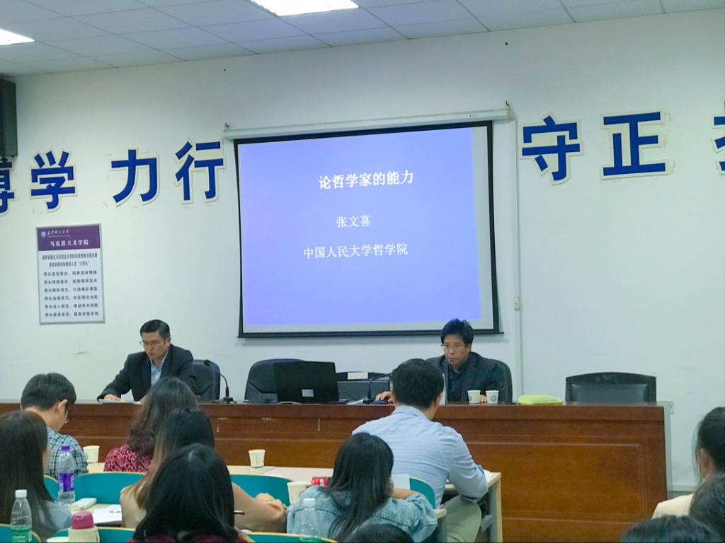 2018年10月12日下午14点,中国人民大学哲学院博士生导师、张文喜教授,应邀在taptap点点云塘校区文科楼C202报告厅进行了题为“论哲学家的能力”的学术讲座。taptap点点马克思主义学院陈万球院长、张明海副院长、部分教师和全体研究生聆听了此次讲座。讲座由马克思主义学院院长陈万球教授主持。
