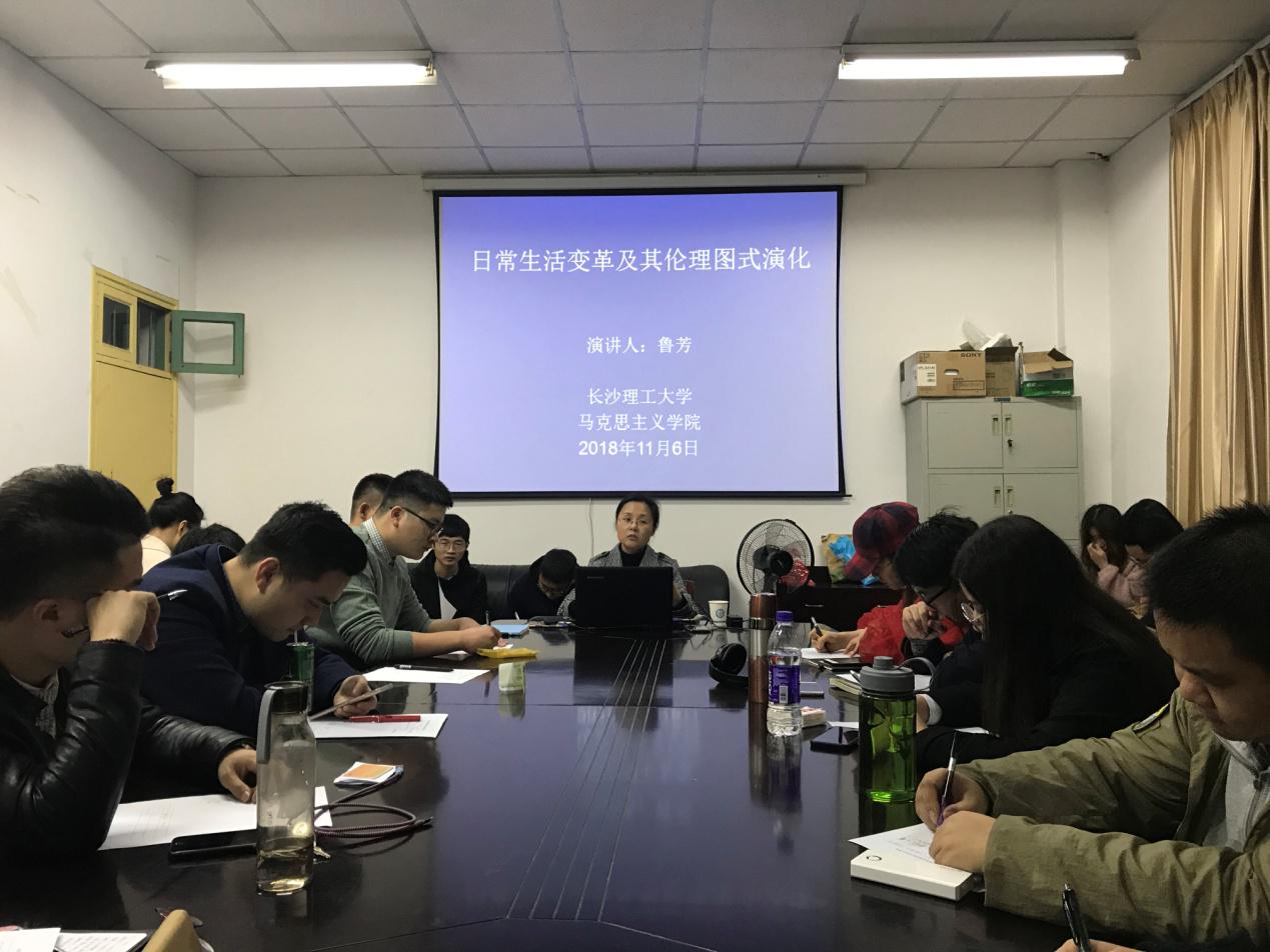 2018年11月6日晚七点半,taptap点点体育马克思主义学院鲁芳教授在金盆岭校区四教503会议室为全院2018级哲学、马理论专业研究生带来了一场题为“日常生活变革及其伦理图式演化”的专题讲座。