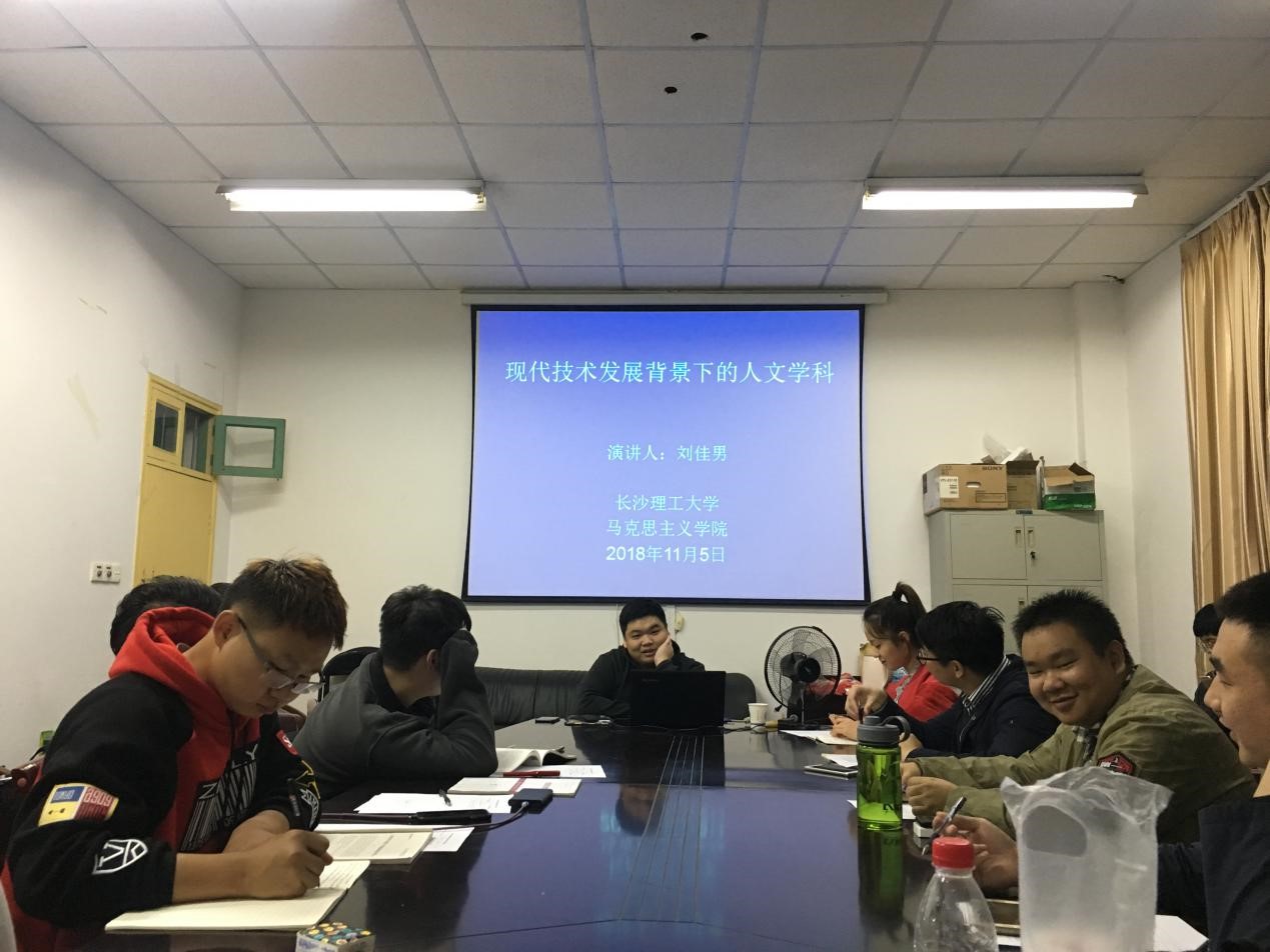 2018年11月5日,科技与社会发展研究所副所长 、湖南省自然辩证法研究会理事、中国自然辩证法研究会科学文化专业委员会理事、taptap点点体育马克思主义学院刘佳男老师为2018级马克思主义研究生带来一场题为“现代技术发展背景下的人文学科”专题讲座。讲座由马田田主持,全体18级研究生参加。