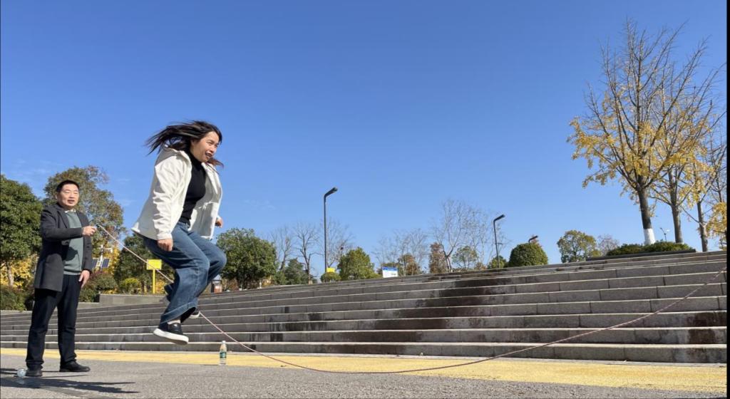 跳长绳比赛在湖畔广场率先点燃活动激情。各工会小组组成参赛队伍集团作战,参照校运会比赛规则,以2分钟全队跳过的人次数总和为比赛成绩。各组队员紧张有序,首尾相连,鱼贯而入,依次跳跃,充分展现了高度的集体荣誉感和团队协作精神。广大观众既为配合默契、无缝衔接、姿势优美的队员鼓掌欢呼,也给予紧张退避、踩错节奏的队员加油鼓劲。队员们竭尽全力,观众和队友们时而赞叹,时而惋惜,比赛活动竞争激烈又温情四溢。经过紧张热烈的比赛,最终第三工会小组(德法概论组)获得第一名,第二工会小组(纲要概论组)获得第二名,第一工会小组(原理行政组)屈居第三名。