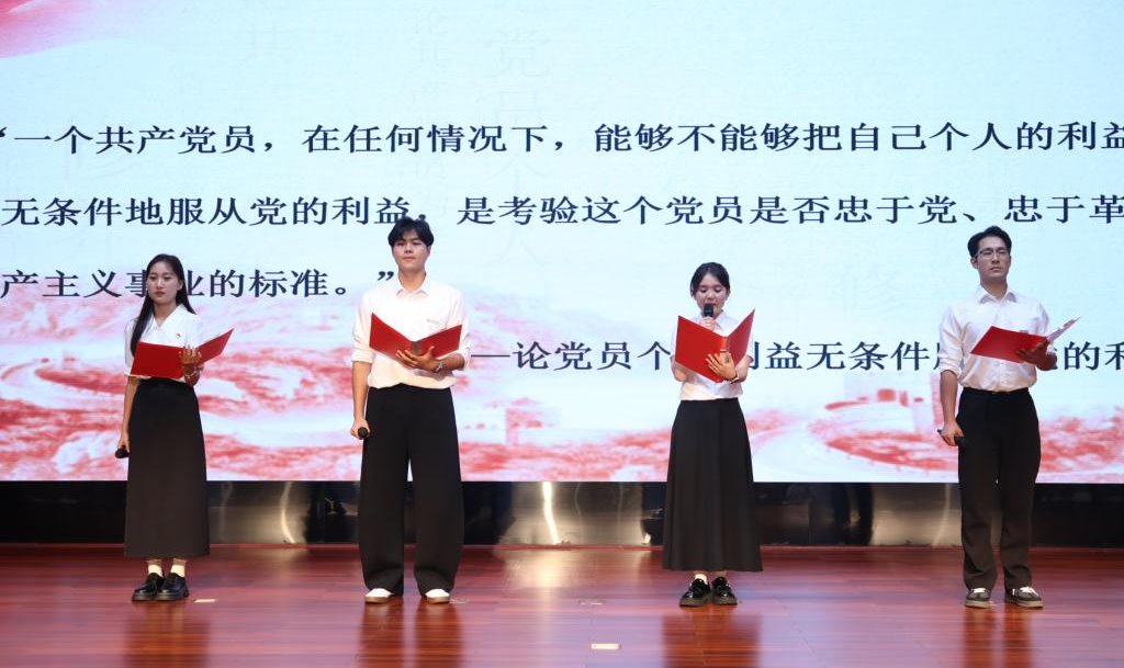 在诵读《品味经典》环节,学生代表领诵刘少奇《论共产党员的修养》节选。“为了党的、无产阶级的、民族解放和人类解放的事业,能够毫不犹豫地牺牲个人利益,甚至牺牲自己的生命,这就是我们常说的‘党性’或‘党的观念’‘组织观念’的一种表现。”师生们齐声诵读,让信仰之根在青年学子心中深深种下。