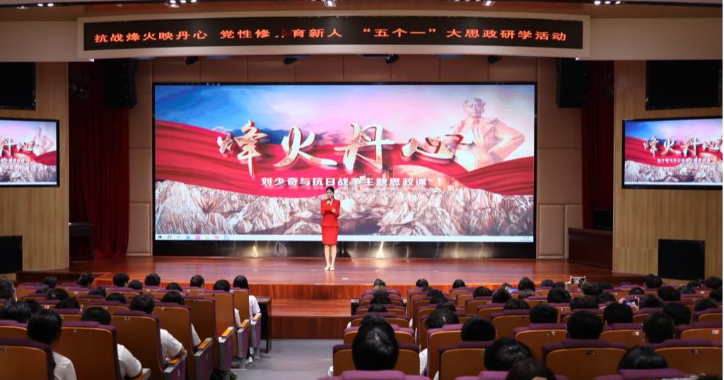 在刘少奇与抗日战争主题思政课上,情境式演绎让历史“活”了起来。同学们仿佛穿越回抗战烽火岁月,刘少奇同志在大树村推动减租减息时对群众的深切关怀,以及微山湖“零号首长”保护行动中转移与布防的紧张时刻,都被具象呈现,令大家感同身受。唱红歌环节,师生们齐声高唱《歌唱祖国》《团结就是力量》,嘹亮的歌声久久回荡。