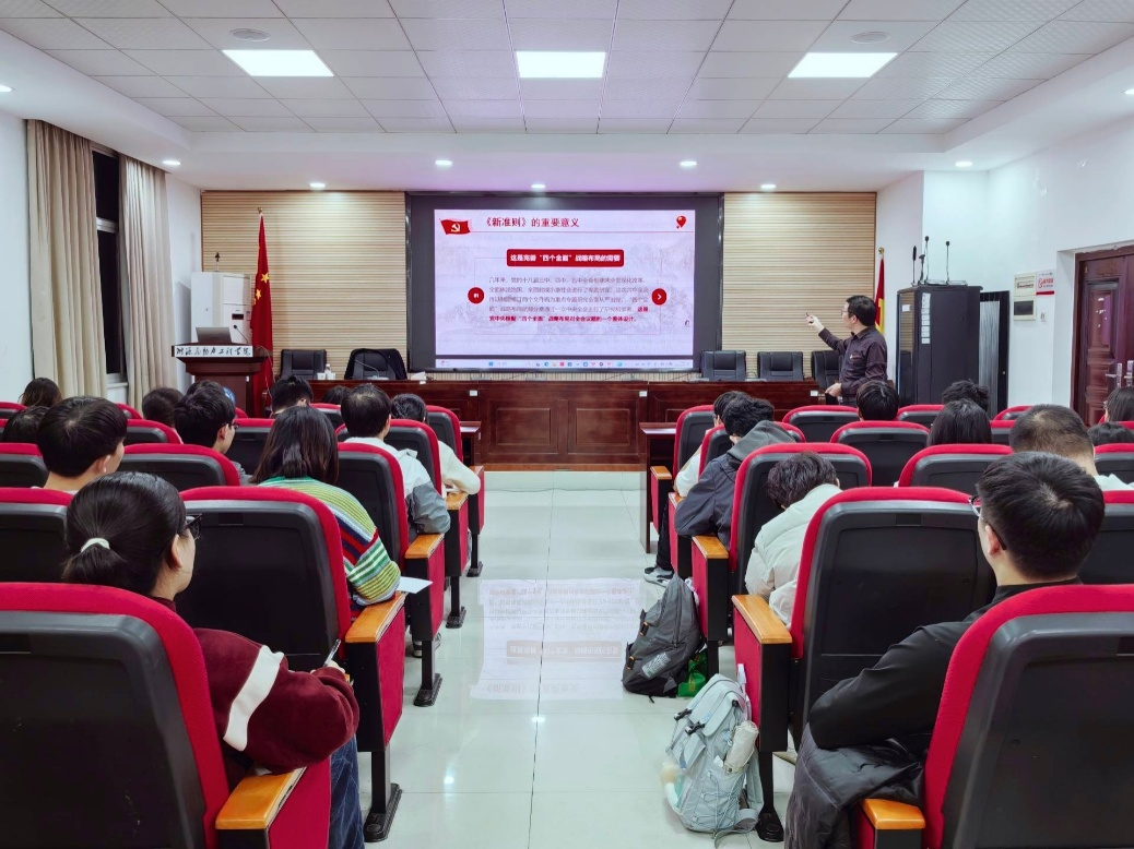 11月3日晚19点,能动学院于新能源大楼二栋502组织了第三十二期预备党员第二节党课。本次党课由校党委宣传部副部长涂道勇讲授,党课内容为《关于新形势下党内政治生活的若干准则》(以下简称《准则》),第三十二期预备党员培训班全体同学参与学习。