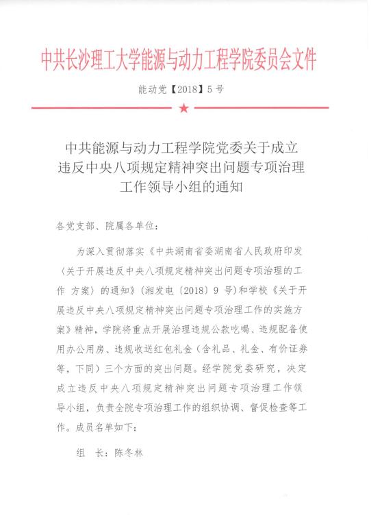 中共能源与动力工程学院党委关于成立违反中央八项规定精神突出问题专项治理工作领导小组的通知