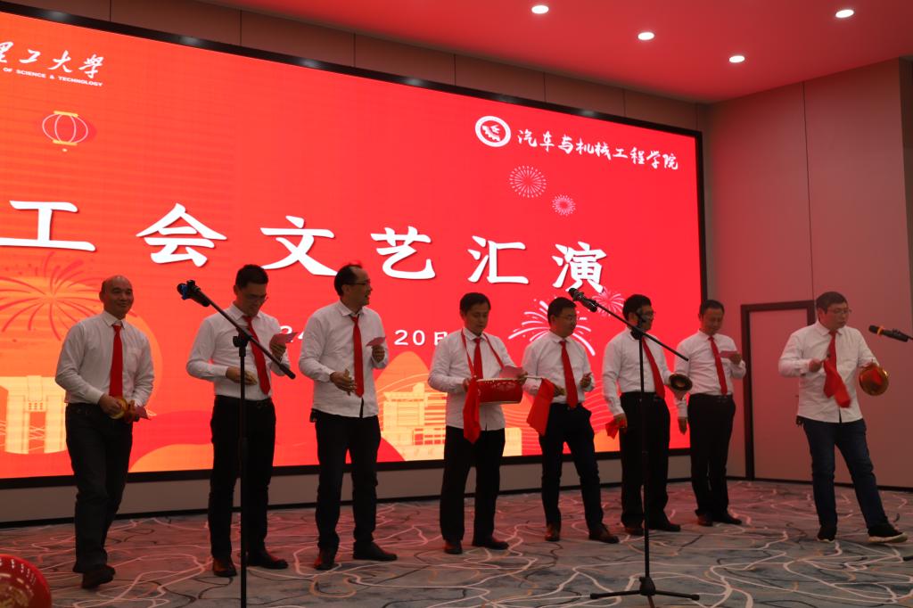 文艺汇演由学院学工办的彭琼英和蔡翔羽两位老师担任主持,共有14个节目,在学院领导班子劲爆的说唱曲艺《三句半》中拉开序幕。节目精彩纷呈,朗诵类节目有:汽车系的《我爱科研》,行政办的《上班快乐》,机械基础教研室的《我们爱帅哥》。歌曲类节目有:歌舞队的《这实际那么多人》,智能制造系的儿童独唱《中国话》,合唱《不忘初心》,机电系的合唱《朋友》,测控系的独唱《最初的梦想》,实验中心的独唱《往日时光》,汽车系的合唱《光辉岁月》。测控系徐晓强和刘文正两位老师表演的双簧-《洗脚城》,幽默诙谐,嗨翻全场。五人合作的方言荟萃节目《汽机干杯》,彰显了浓厚的地方文化特色。机械基础教研室陈宇锋老师的古筝独奏《渔舟唱晚》,旋律婉转悠扬,令人陶醉其中。表演间隙,还设置了多轮抽奖,将欢快喜庆气氛推向了高潮。