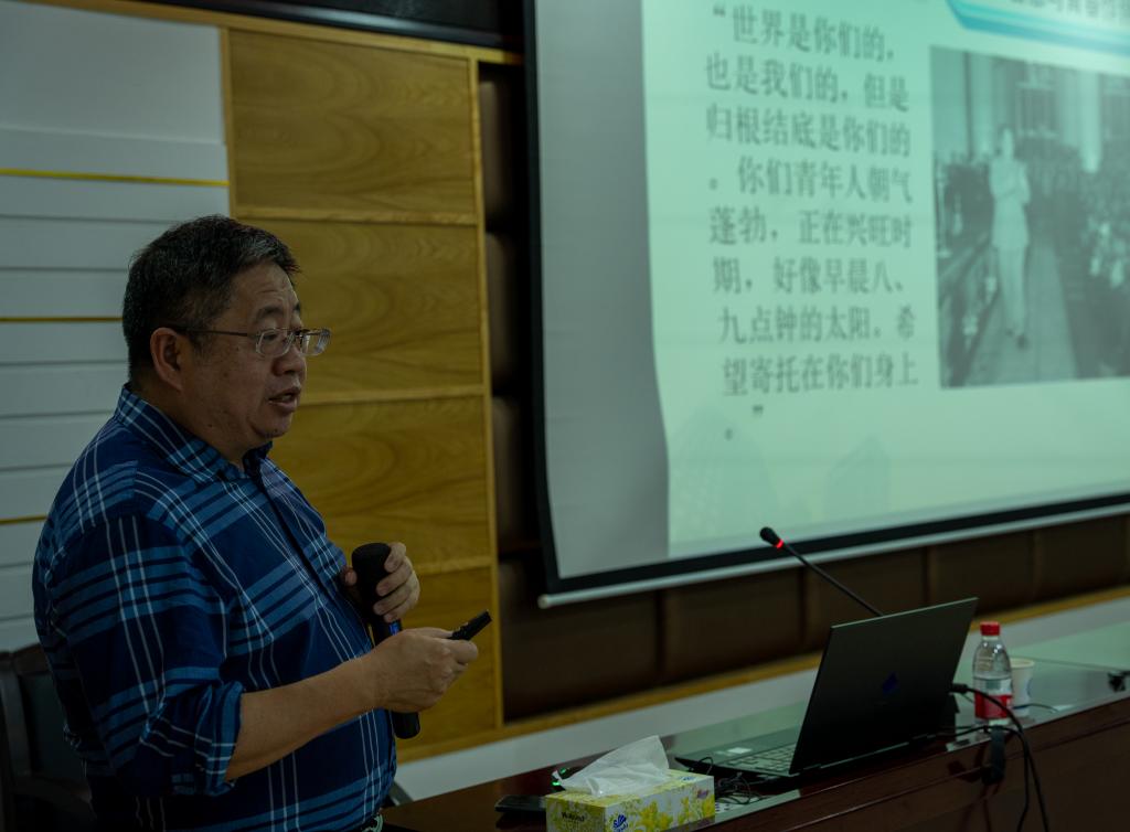 彭继红以提问的形式切入主题,从“党的实践智慧是什么、党的实践智慧的意义以及广大青年党员如何汲取实践智慧”等三个方面展开。他详细讲述了中国共产党的生存智慧、应变智慧、创新智慧、组织智慧和务实智慧。整个授课过程中,彭继红引经据典、旁征博引,结合党的发展历程,深刻阐明了实践性是马克思主义哲学的力量所在。最后,他勉励学生们要勇于在实践中创新,勤于创新,乐于实践,不断凝聚智慧。