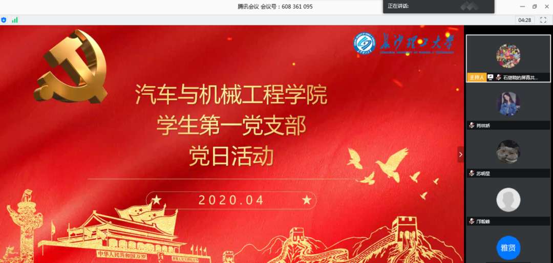 2020年4月29日晚,汽车与机械工程学院各学生党支部组织开展主题多样的线上党日活动,全体学生党员按时参加。