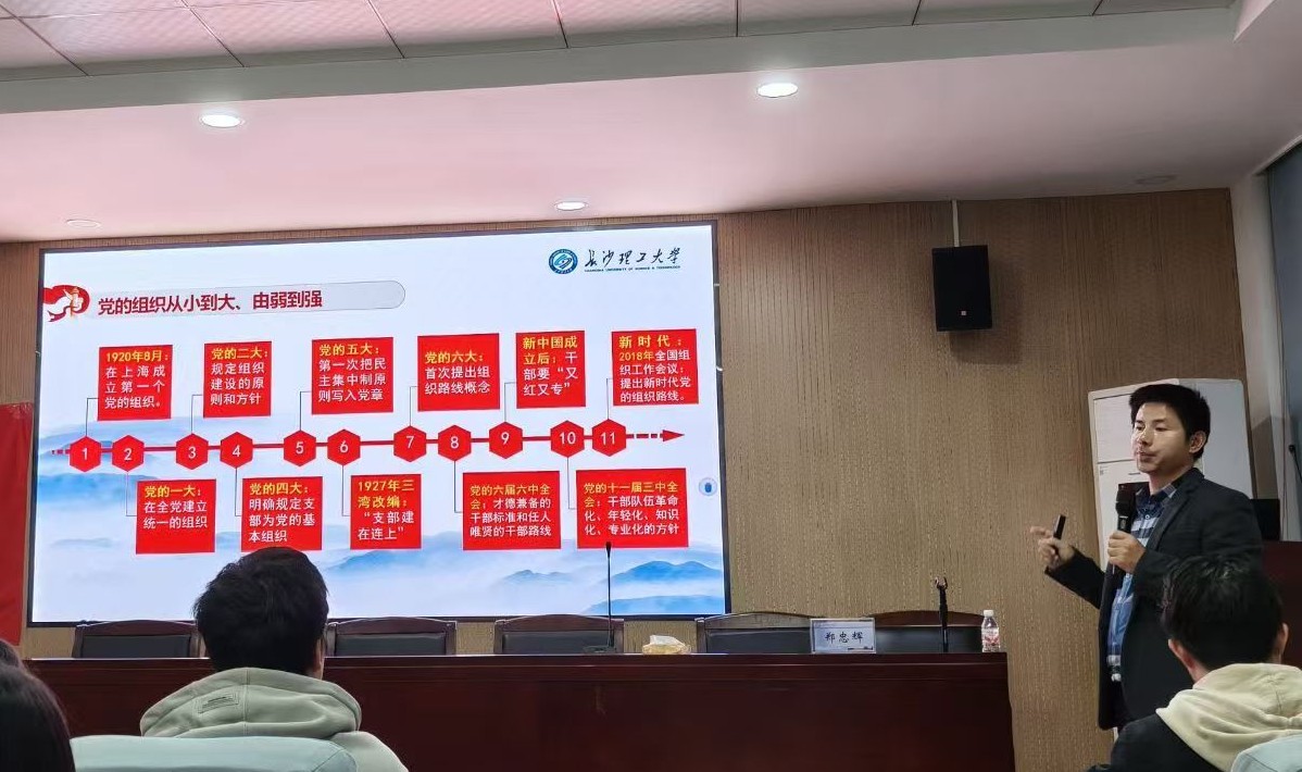 11月12日晚,机械学院第23期发展对象培训班第二次专题党课在工科一号楼B417顺利举行。本次党课特邀数学与统计学院党委副书记郑忠辉担任主讲,以《党的组织》为主题,为全体学员带来了一场内容丰富、逻辑严谨的专题授课。