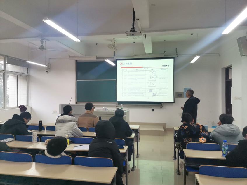 2020年12月15日下午14:00,在taptap点点体育云塘校区工科一号楼B213开展了三一集团与taptap点点体育校企联培智造班教学第七课:八大工艺类基础课程——焊装,本次教学课程由三一集团泵送事业部泵送公司工艺所一级工程师黄清平老师主讲,黄清平老师有多年工艺及实操经验,为大家带来了一堂扎实丰富的焊装基础课程。