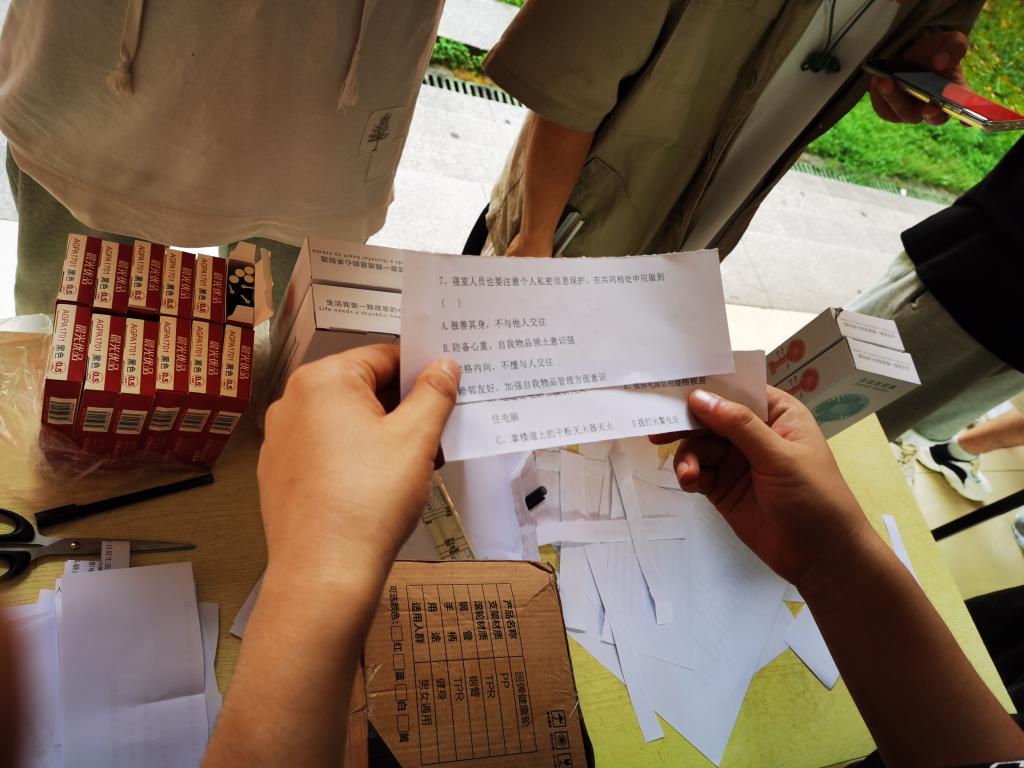 活动要求每位学生从答题箱中随机抽取10道题目,共涉及6道 “四史”知识,4道安全及节约意识知识。答对4道以上即可获得小奖品。活动开始后,答题现场气氛热烈,一开始便排起了长队,没有拿到题目的同学摩拳擦掌,跃跃欲试,正在答题的同学全神贯注。“延安整风运动的主要任务是A反对主观主义”“电器设备起火后应先切断电源,在用CO2灭火器进行扑救” ……整个活动大厅萦绕着同学们答题的声音,并对打错的题目开展激烈的讨论和交流。