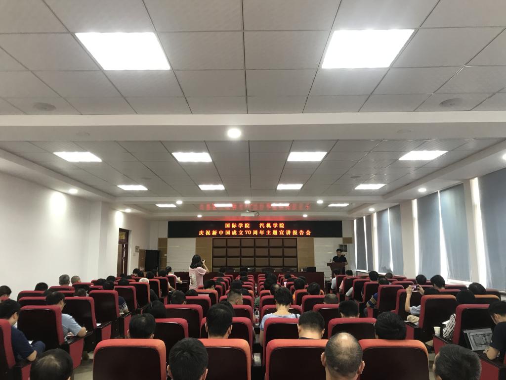 9月24日下午两点,国际学院、汽机学院庆祝新中国成立70周年主题宣讲报告会在工一B417举行。国际学院部分师生、汽机学院全体教职工和部分学生党员代表参加,学院有幸邀请到学校党委委员付嫦娥教授担任主讲,学院党委书记邱国良担任主持人。