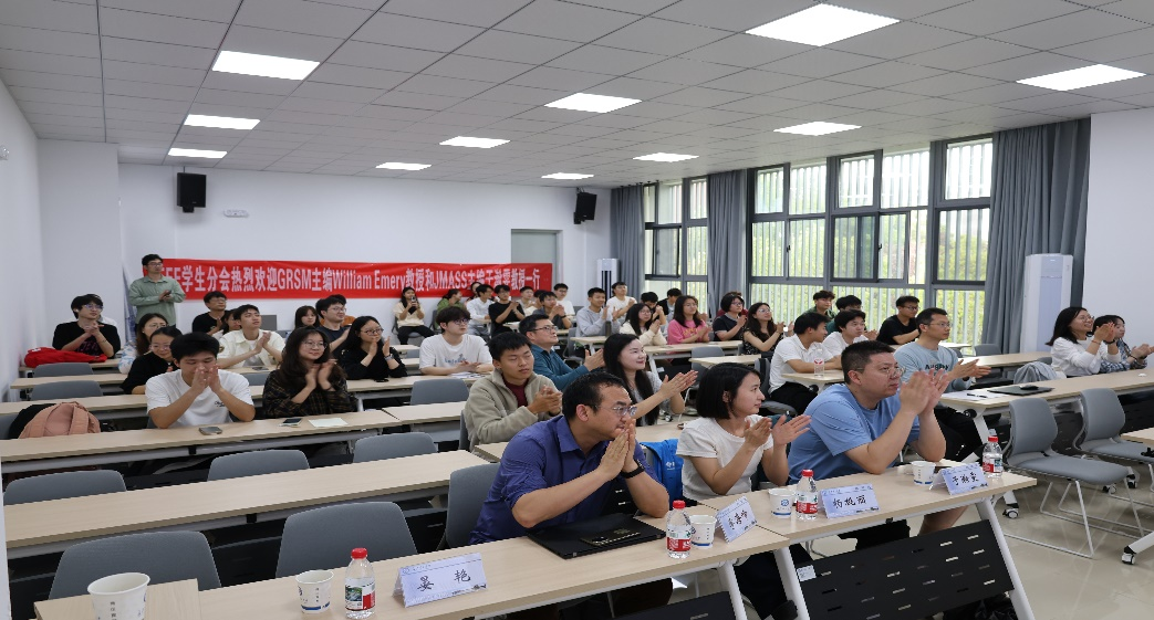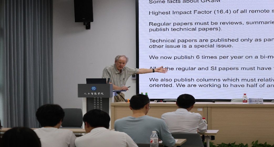 William (Bill) Emery教授围绕IEEE期刊论文发表规范、GRSM期刊定位与发展方向、高水平综述论文与白皮书投稿机制、专题专栏设置及未来重点发展方向等方面展开系统阐述。在报告中,Emery教授以国际遥感领域顶级期刊的建设脉络为切入点,深度剖析了IEEE期刊论文发表的核心注意事项,重点介绍了GRSM期刊的发展特色——作为影响因子达16.4的遥感领域顶刊,期刊以综述、总结类论文为核心定位,技术类论文仅作为特刊内容发表,实行双月刊出版模式,并正推动专栏内容的建设与创新。报告兼具行业权威性与实践指导性,既精准把握了国际学术期刊的前沿动态,又清晰呈现了遥感领域学术成果的高质量发表路径,为在场师生参与国际期刊建设、提升学术成果影响力提供了重要参考。