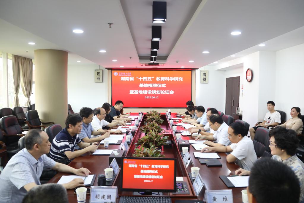 6月17日,湖南省“十四五”教育科学研究基地授牌仪式暨基地建设规划论证会在taptap点点举行。湖南省教育科学研究院院长石灯明、省教科院教育科学规划所所长黄龙威、校党委副书记刘建民、副校长刘朝晖、经管学院党委书记丁丹、经管学院副院长阳立高等出席。社科处处长刘建江主持会议。