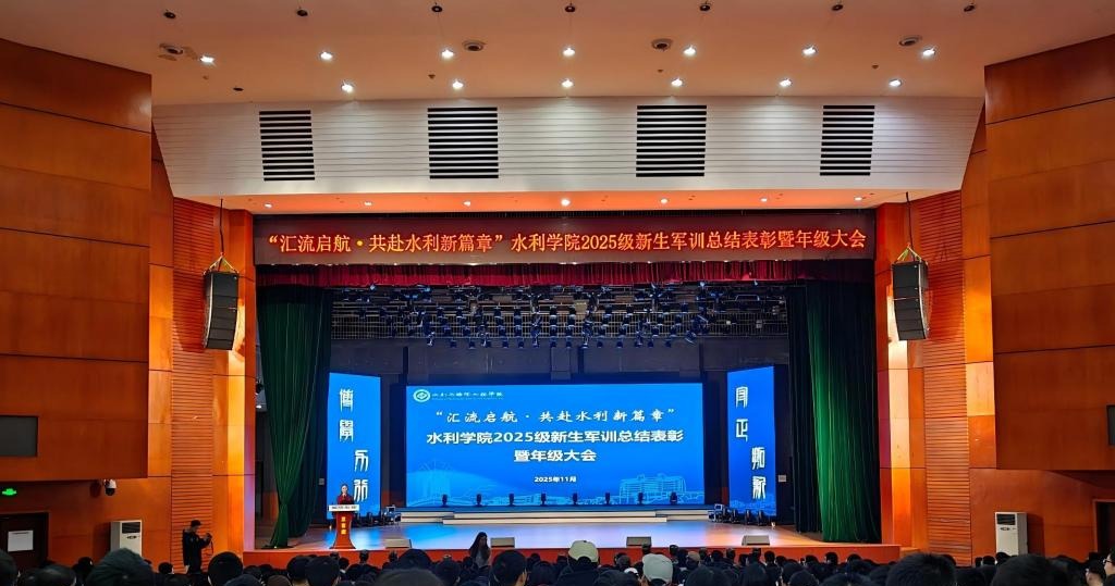 11月15日晚,水利与海洋工程学院在云塘校区大会堂举行“汇流启航,共赴水利新篇章”2025级新生军训总结表彰暨年级大会。学院党委副书记银波、2025级年级辅导员王祎、王正博及全体2025级本科生、军训教官出席。