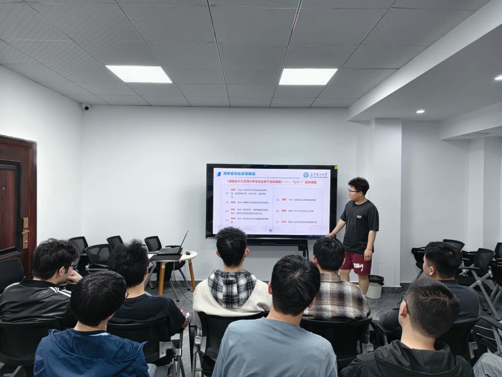 解读创业政策,提供发展平台。在创业教育环节,班会分为“政策解读”与“实操指引”两部分。详细介绍了省级、校级创业扶持政策,涵盖学业支持、保研倾斜、赛事奖金等内容;并重点讲解了创业园区孵化资源、入驻条件及全流程操作,为学生提供从政策到落地的清晰指引。
