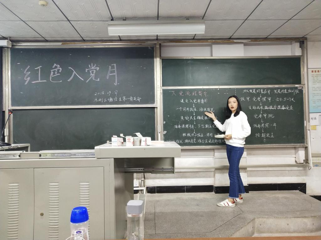 2018年9月27日,为了充分发挥学生党员在优化学风校风、创建和谐校园中的先锋模仿作用,激励新生以优秀学生党员为榜样,努力学习,奋发向上,积极向党组织靠拢,水利云塘学生第一党支部在金盆岭12教116举行了新学期第一次党日活动。会议由唐维婕同志主持,水利云塘学生第一党支部全体成员以及18级水电所有同学参加此次活动。