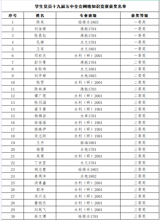 为贯彻学习党的十九届五中全会精神,引领我院学生党员进一步坚定中国特色社会主义理想信念,强化责任意识与担当精神,2020年12月,中共taptap点点体育水利工程学院学生总支部委员会组织了党的十九届五中全会网络知识竞赛。根据竞赛成绩,陈笑等6名同志获一等奖,彭尔曼等6名同志获二等奖,张羽涵等18名同志获三等奖。现将获奖名单公示如下,希望各学生支部党员能再接再厉,增强学习自觉,不断提高思想理论水平,做忠诚干净担当的合格党员。