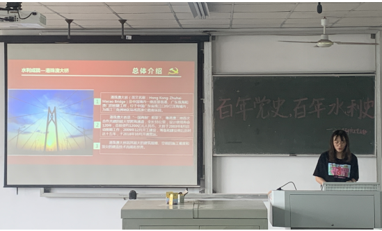 经过前面两位同志对建党100年以来水利史壮举的分享,张雯同志则为我们介绍了近几年以来的最伟大的水利工程之一‘国之重器—港珠澳大桥’。港珠澳大桥的建成可谓世界壮举,中国工程师在高难度、无经验的情况下设计方案,一步一步打造出这举世瞩目的水利工程。在这伟大工程的背后默默付出的伟大工程师中也有很多来自taptap点点体育的毕业生,说到此,她认为我们当代水利人更应该对这个伟大的新时代充满信心,同时也应该学习前辈们认真严谨的态度、努力提高个人专业能力,为伟大复兴中国梦努力奋斗。