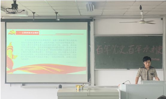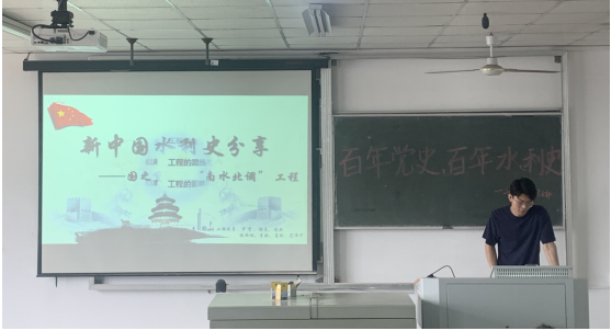 在党悠久的历史中,党始终把水利建设放在第一位。在新中国成立后,熟谙中国历史和善于以史为鉴的毛泽东主席带领我党在水利建设上取得了一系列举世瞩目的重要成就。郭洋同志以淮河治理工程为例,他讲述到淮河治理工程始于1950年,在治淮的这八个年头里,河南、淮北、苏北共投入民工几百万人,治理大小河道175条,修建水库九座,库容量达316亿立方米,修建堤防4600多公里,他表示整治淮河的伟大实践充分表现了我们党把人民利益至于一切利益之上,全心全意为人民服务的宗旨和情怀。