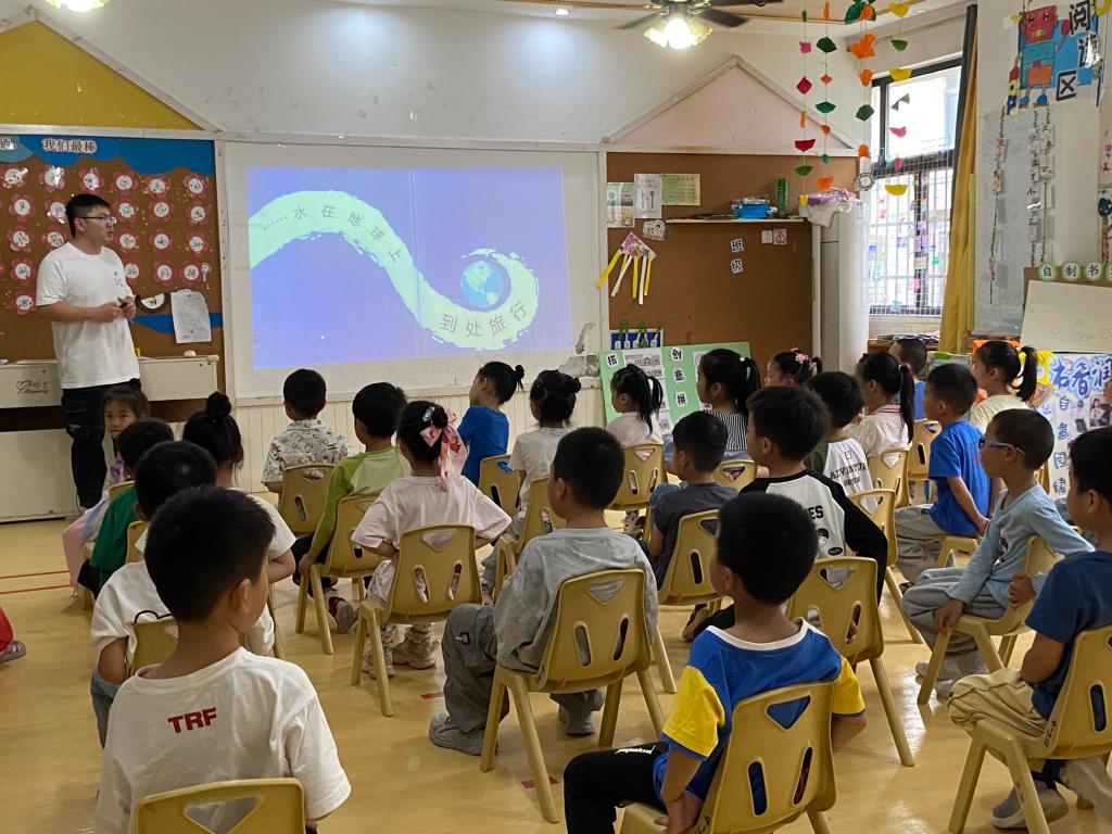 活动伊始,邹欣辰同志以绘本《水的奇妙旅程》为引,用生动的语言和多彩的插图向孩子们讲述水的循环故事。小朋友们围坐聆听,通过“云朵旅行”“雨滴冒险”等情节,直观理解水从蒸发到降落的自然过程,现场互动氛围热烈。随后,王阳鸿泰同志化身“科学老师”,通过趣味问答和模型演示,向孩子们科普水的分子结构、液态特性及在生活中的重要作用。他借助生活案例,如“水为什么能灭火”“植物如何喝水”,引导孩子们思考水的不可替代性,并呼吁珍惜每一滴水。