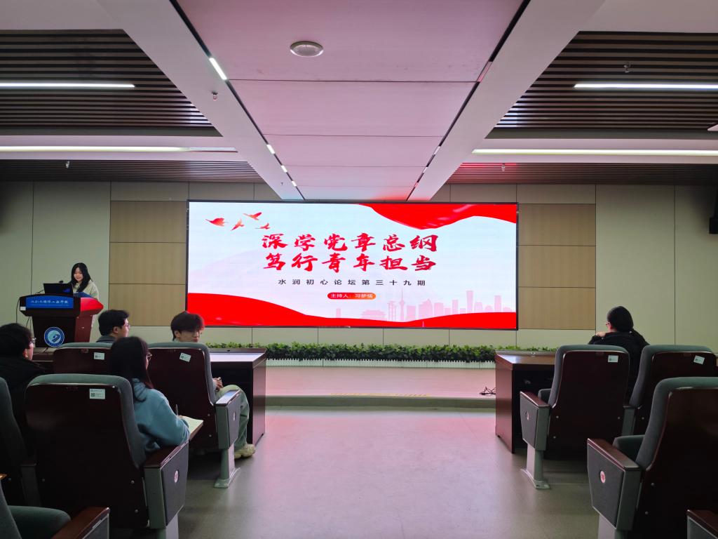 3月24日晚,水利学院在新能源一栋二楼会议室举办了主题为“深学党章总纲,笃行青年担当”的第三十九期“水润初心”学习论坛活动。本次活动由本科生第三党支部入党积极分子习梦恬同志主持,共有104名同志参加。