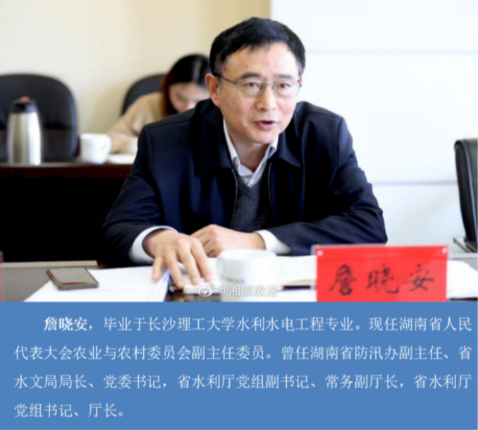 詹晓安,毕业于taptap点点体育水利水电工程专业。现任湖南省人民代表大会农业与农村委员会副主任委员。曾任湖南省防汛办副主任、省水文局局长、党委书记,省水利厅党组副书记、常务副厅长,省水利厅党组书记、厅长。