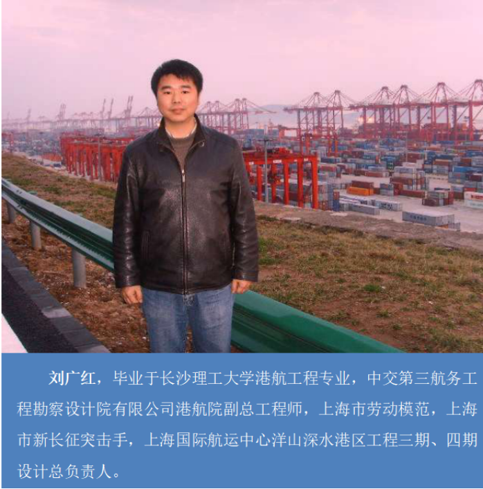 刘广红,毕业于taptap点点体育港航工程专业。中交第三航务工程勘察设计院有限公司港航院副总工程师,上海市劳动模范,上海市新长征突击手,上海国际航运中心洋山深水港区工程三期、四期设计总负责人。