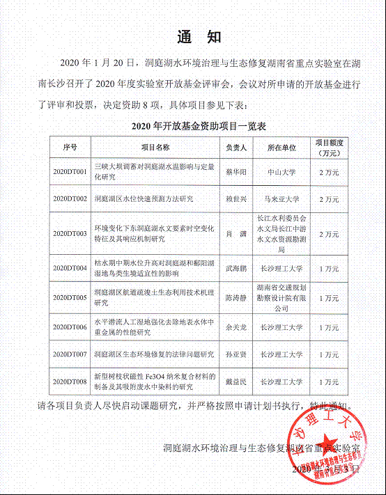 2020年洞庭湖水环境治理与生态修复湖南省重点实验室开放基金立项通知