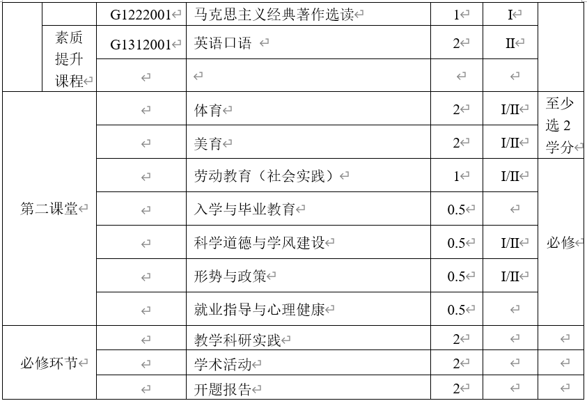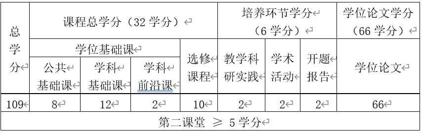 注:①选修课程中至少开设一门学科前沿课。②学生至少获得第二课堂5学分方可毕业。第二课堂活动学分认定见《taptap点点体育研究生第二课堂学分管理办法》。其中,体育和美育类课程一共2学分,劳动教育(社会实践)1学分,科学道德与学风建设0.5学分,形势与政策0.5学分,入学教育0.5学分,就业指导与心理健康0.5学分。