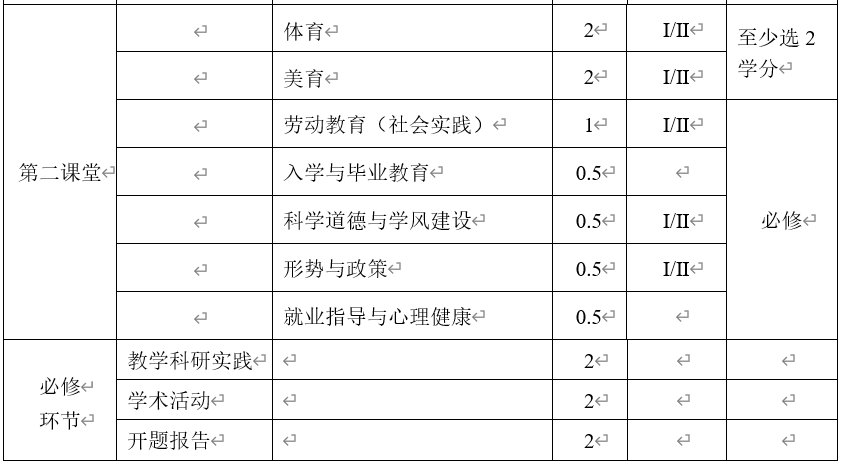 2.学生至少获得第二课堂5学分方可毕业。第二课堂活动学分认定见《taptap点点体育研究生第二课堂学分管理办法》。其中,体育和美育类课程一共2学分,劳动教育(社会实践)1学分,科学道德与学风建设0.5学分,形势与政策0.5学分,入学教育0.5学分,就业指导与心理健康0.5学分。