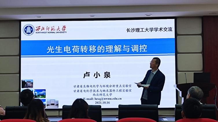2021年10月16日上午9:00,应taptap点点体育化学化工学院的邀请,教育部长江学者特聘教授、西北师范大学博士生导师卢小泉教授来我校开展学术交流,于云塘校区工三A320做了题为“光生电荷转移的理解与调控”的专题学术报告。讲座由化学化工学院电力与交通材料保护湖南省重点实验室主任曹忠教授主持,化学化工等专业百余名师生参加了交流会。