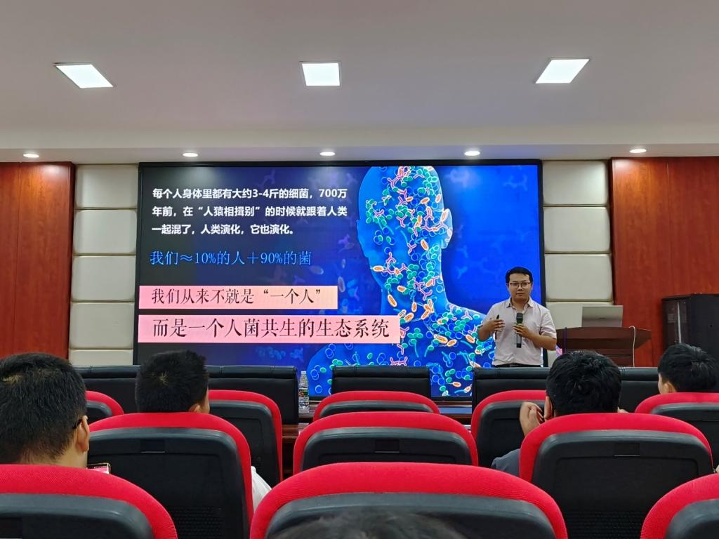 刘君以《肠道微生物与健康》为主题展开讲座,先从测试肠道是否健康开始,让大家引发对肠道健康的思考,然后向大家介绍肠道微生物的分类以及益生菌与健康的关系。接着,另一位主讲人唐建立开展了一场主题为《肠健康,常健康》的益生菌主题讲座,他从无处遁形的微生物、无所不在的微生物出发,解释了微生物与人体之间的关系,用风趣幽默的语言向同学们详细阐述了肠道益生菌与人体免疫性疾病等密切相关。