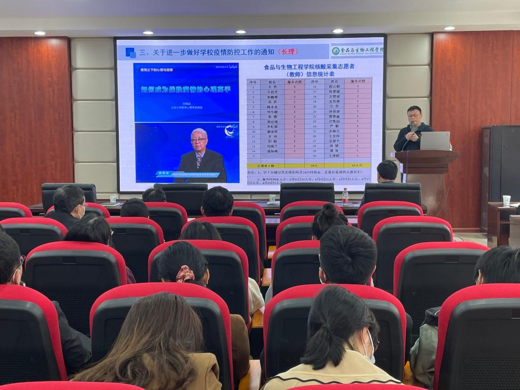 随后,王建辉传达了湖南省教育厅发布的《关于进一步做好学校疫情防控工作的通知》精神,以及学校防控办发布的《关于做好新冠肺炎疫情防控培训的通知》精神。他首先对学院党员教师参加学校抗疫期间的志愿者活动进行了总结和表扬,从3月31日至4月19日,学院共有29名党员积极报名参加了五次核酸采集,学工办的老师们更是24小时待命,冲在学校抗疫的前线,他们用真情坚守和积极行动,守护着师生们的生命健康和校园的平安幸福。其次对目前学院疫情防控工作提出三点要求:一是校园内师生必需佩戴口罩,注意做好个人防护,非必要少外出,合理开展校内聚集性活动;二是做好疫情防控政策的宣传,各系办要组织学习新冠肺炎防控知识和个人防护培训技能;三是做好心理疏导工作,积极帮助师生员工解决学习、工作和生活中的实际困难。