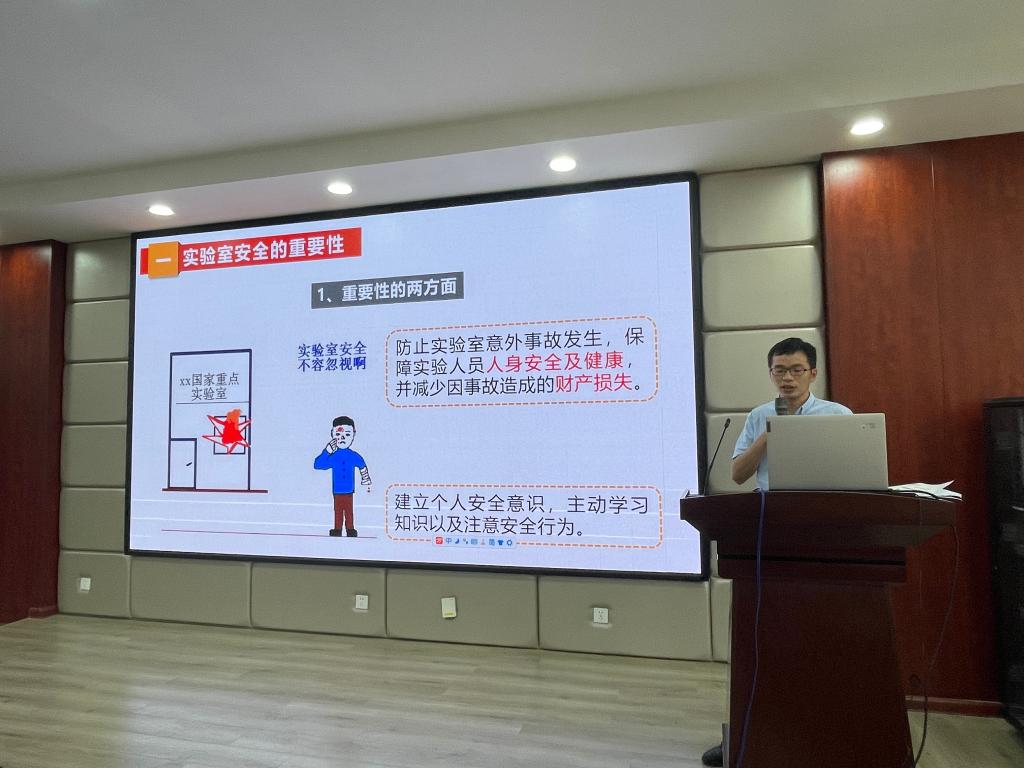 会上还对所有参会师生进行了安全知识培训,实验中心主任陈茂龙从实验室安全的重要性、危险化学品的使用和防护、认识实验室的危险以及如何做好实验室的安全工作这四个方面对实验室的安全问题进行了详细的阐述。
