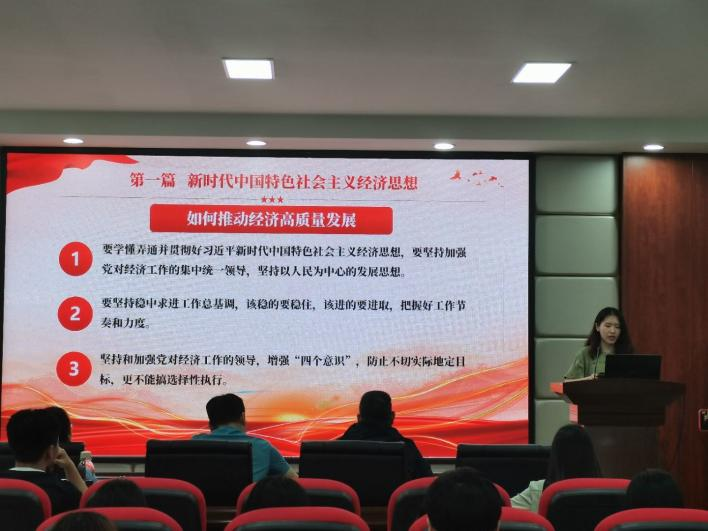 读书班学员左灵睿、谭润琰、谢新阳三名同志,分别从当下经济形势出发思考现代化经济体系建设、民营经济与区域经济等方面改善经济发展不平衡问题以及发展海洋经济三个方面阐述了新时代中国经济发展现状。