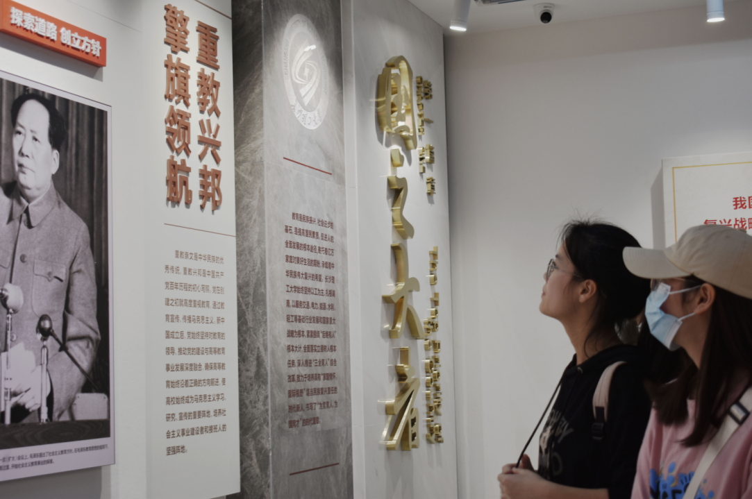 在讲解员生物类2201班吴妍雨同学的带领下,学员们先后参观学习了“国之大者、材之茂者、师之贤者、行之实者”四大篇章,围绕“立德树人,逐梦报国”这一主题,全方位、多角度的回答了习近平总书记提出的“为谁培养人”、“培养什么人”、“怎样培养人”三个根本问题,生动全面的阐述了新时代习近平总书记对教育发展、青年成长等方面的殷切嘱托。一项项耀眼的荣誉,一个个精巧细致的微缩模型,一张张承载了记忆的照片,都向同学们展现了taptap点点始终坚定党对高校的全面领导不动摇,将为党育人、为国育才的初心使命贯穿始终,不断推进深化“三全育人”整体改革,把立德树人的教育核心任务落到实处。