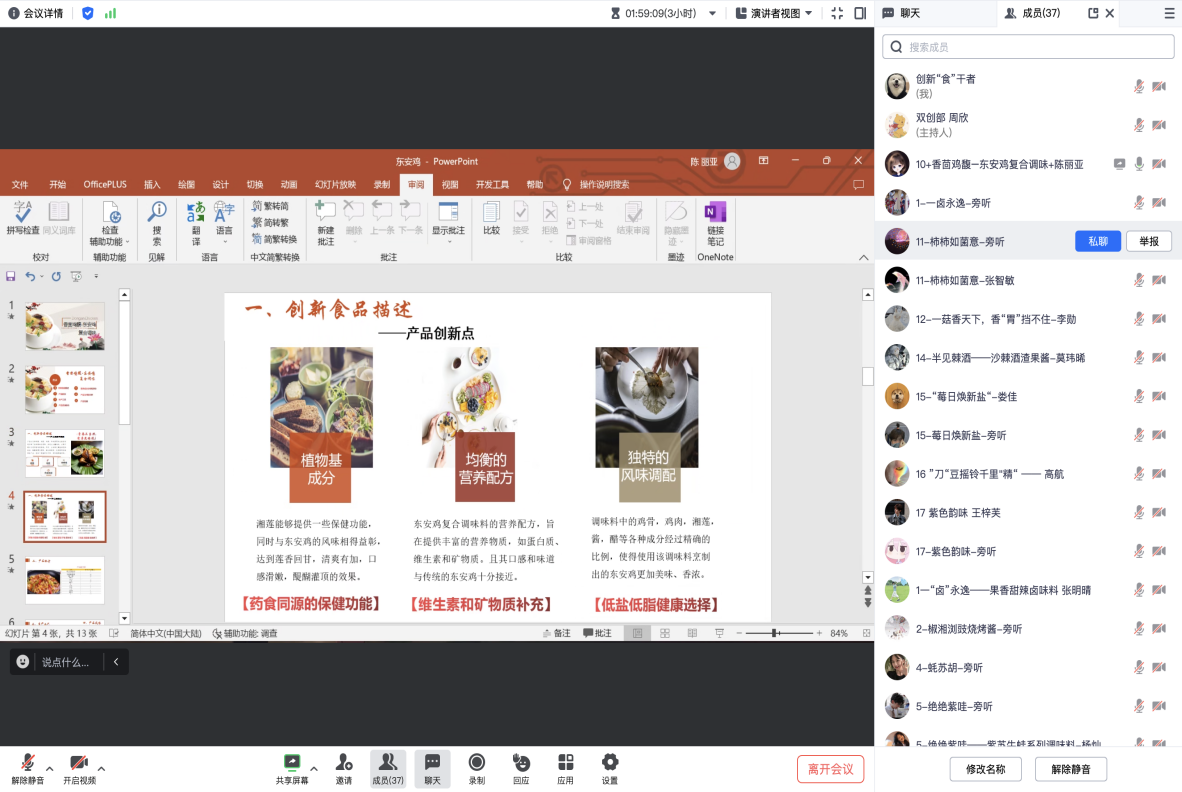本次线上答辩会共有18组参赛队伍参与,每个参赛团队在本次赛程中都进行了充分的准备、思维的碰撞,答辩过程中,每组答辩代表从产品的研发背景、配方工艺、创新性等多方面,简洁明了地向评委老师介绍了产品概况,同时评委老师对每组进行了点评和评分,其中“莓”日焕新“盐”、紫色韵味等作品因独特且创新性强,赢得了评委老师的赞扬肯定以及观众们的一致好评。