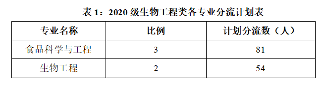 4. 2020级生物工程类本科生135人,在食品科学与工程、生物工程2个专业进行专业分流,按照3:2的比例,各专业分流计划如下: