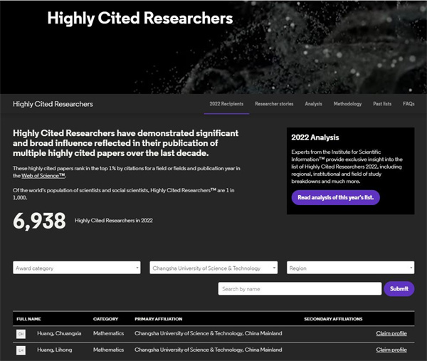 69个国家和地区的6938名科学家入选,其中,中国内地1169人次入选。入选“高被引科学家”榜单,说明该科学家论文被引频次在Web of Science™ 中位于同学科、同发表年份的前1%,体现了在同行之中卓越的学术影响力,为该学科领域的发展作出了重要贡献。