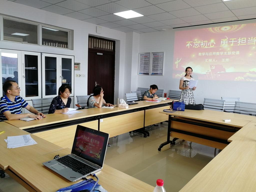 6月3日,数学与应用数学系党支部书记王芳在理科楼A505为支部讲题为《不忘初心 勇于担当》的党课,党课主要从何为初心,深刻理解担当精神的现实内涵,党员干部如何尽责担当,新形势下党员应具备的“八个担当”这几个方面进行阐述。